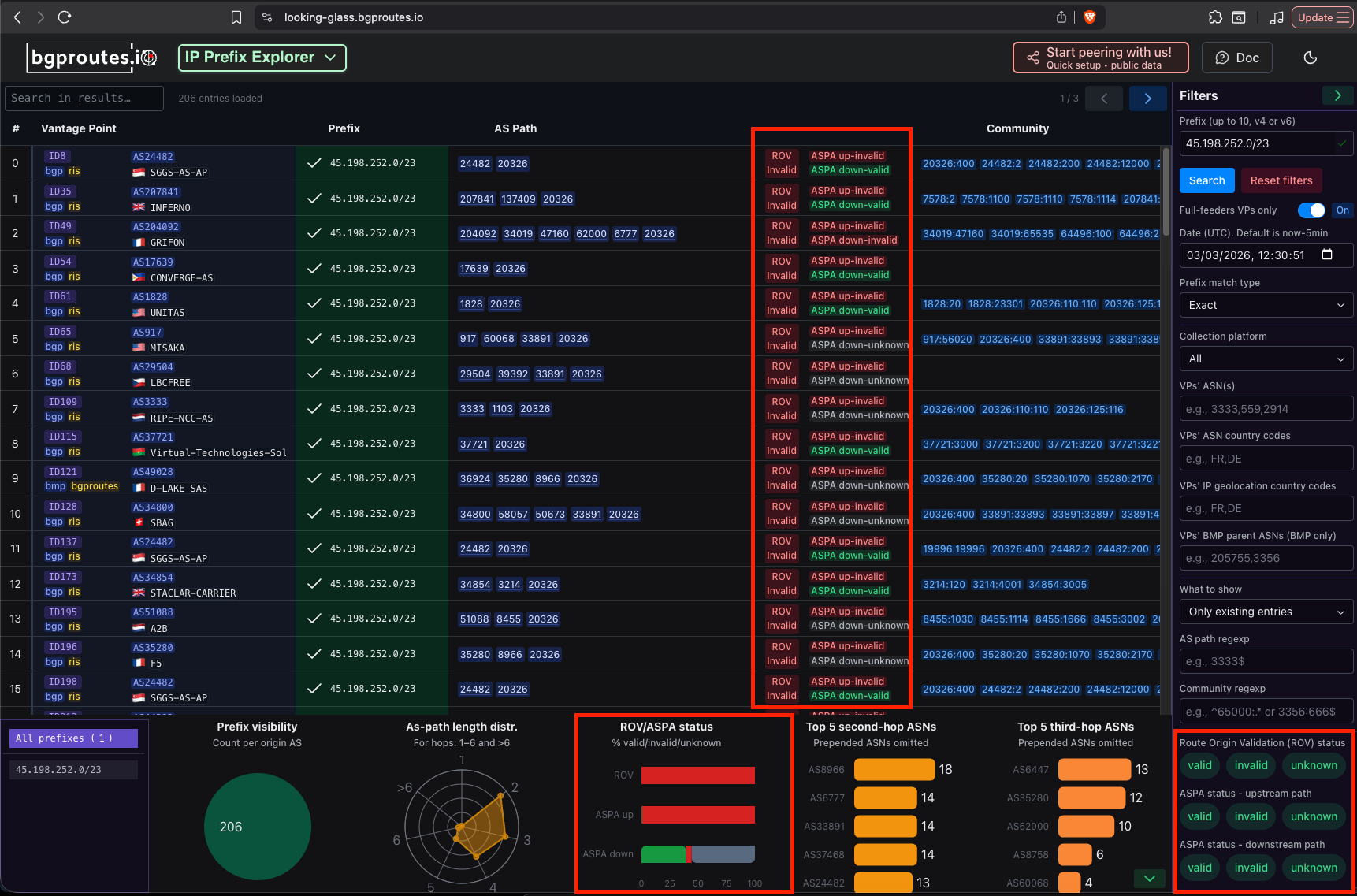 For each route entry, the dashboard now also displays its ROV and ASPA validation status. This makes it easy to quickly uncover things like misorigin hijacked routes targeting your prefix (ROV invalid), policy violations or potential route leaks (ASPA invalid).