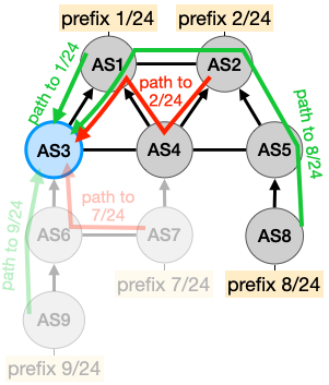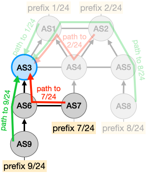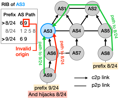 Example. Take for instance the scenario depicted in Figure 1, each node represents an AS and we take the perspective of AS3 (i.e., we are the operator of AS3). AS8 announces prefix 8/24, while AS9 announces 9/24 and also 8/24 due to a misconfiguration, resulting in a mis-origin hijack. Without ROV, AS3 receives two paths to 8/24 but may prefer the hijacked route because it is shorter than the legitimate one.