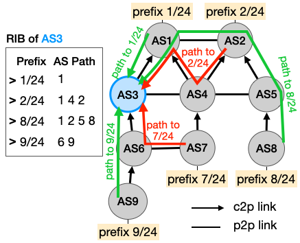 2/24, 7/24, 8/24 and 9/24 respectively (there is no hijack). AS3 receives announcements for these prefixes. However, two of them are leaks: