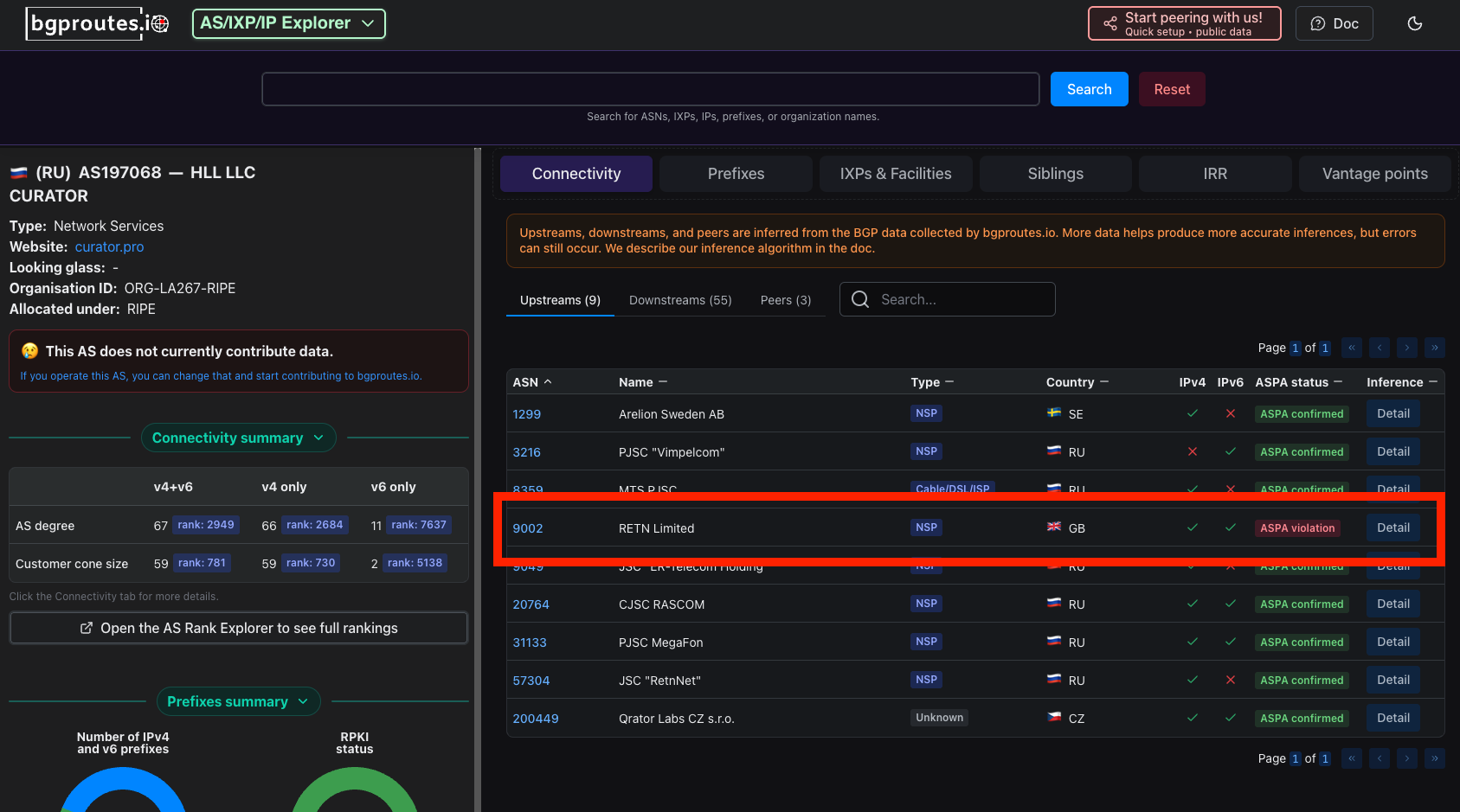 Example. Figure 5 shows an example for AS197068. All inferred providers are also listed as providers in the ASPA object issued by AS197068, except for one: RETN Limited (AS9002). By inspecting the AS paths that led to this inference (by clicking on the “Detail” button), we can better understand the discrepancy. The mismatch likely indicates one of the following: